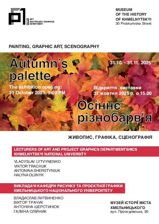 31 жовтня 2025 року в мистецькій залі музею, що на Проскурівській, 30, о 15.00 відкриється колективна виставка живопису, графіки, сценографії викладачів кафедри рисунку та проєктної графіки Хмельницького національного університету під назвою «Осіннє різнобарв`я». |