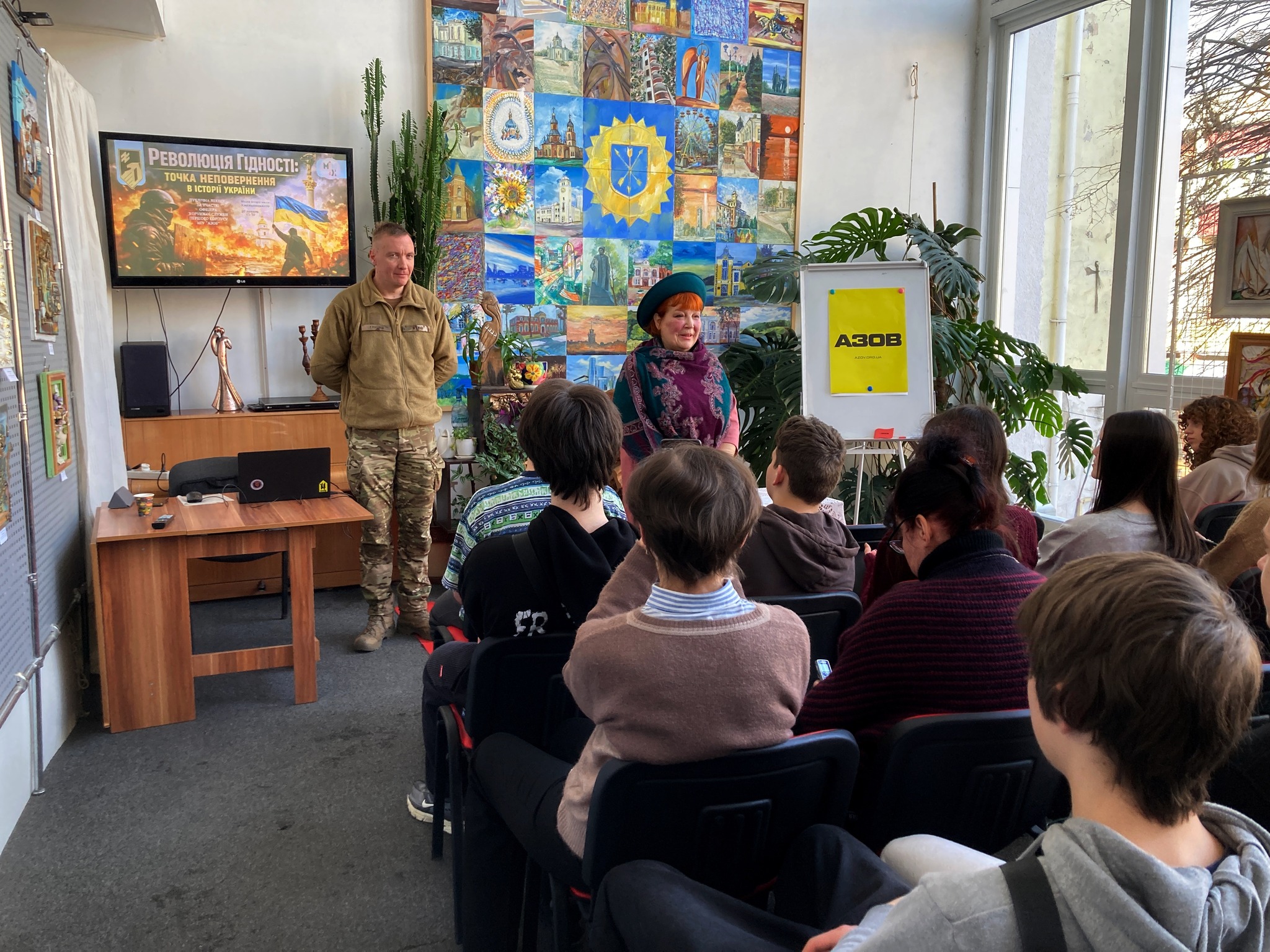 "Революція Гідності: точка неповернення в історії України" - під такою назвою в музеї історії міста Хмельницького у день вшанування Героїв Небесної сотні відбулася публічна лекція за участю військовослужбовця хорунжої служби 12-ої бригади спеціального призначення 1-го корпусу Національної гвардії України «Азов» друга «Данця». |