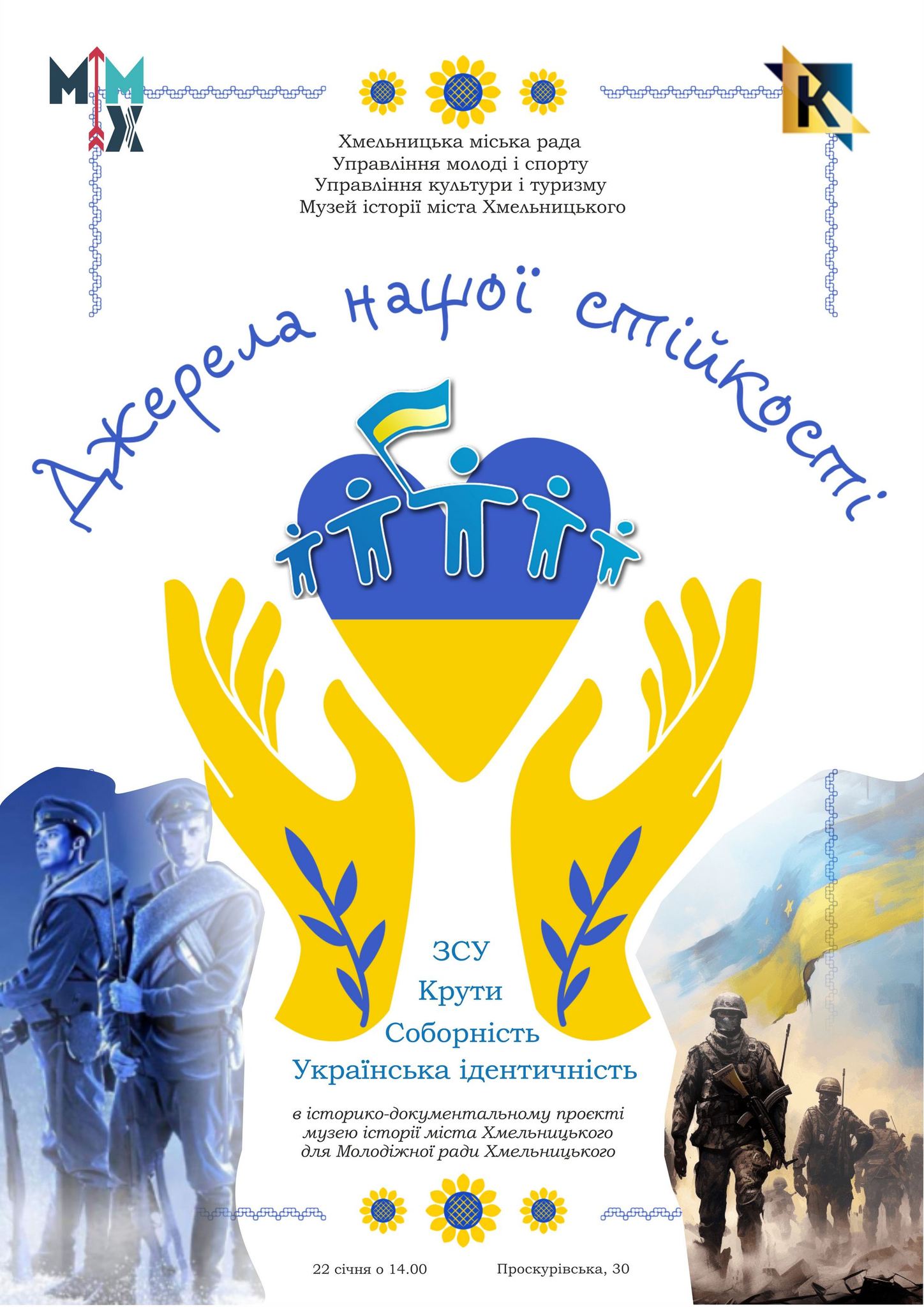 22 січня 2026 року о 14.00 у музеї історії міста Хмельницького відбудеться масовий захід національно-патріотичного спрямування «Джерела нашої стійкості», в якому розглядатимуться одночасно такі взаємопов’язані та нагальні для всіх нас на сьогодні теми, як Соборність України, подвиг Героїв Крут та сучасна російсько-українська війна – у виборюванні української ідентичності. |