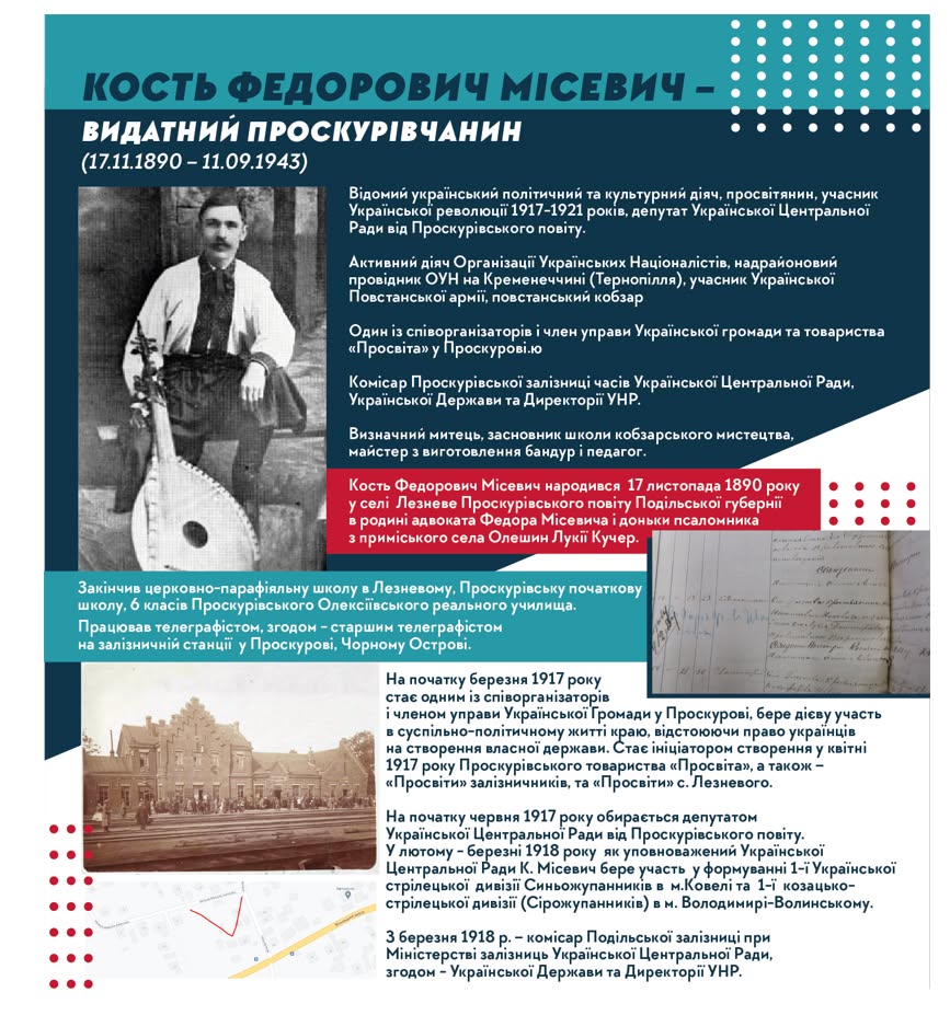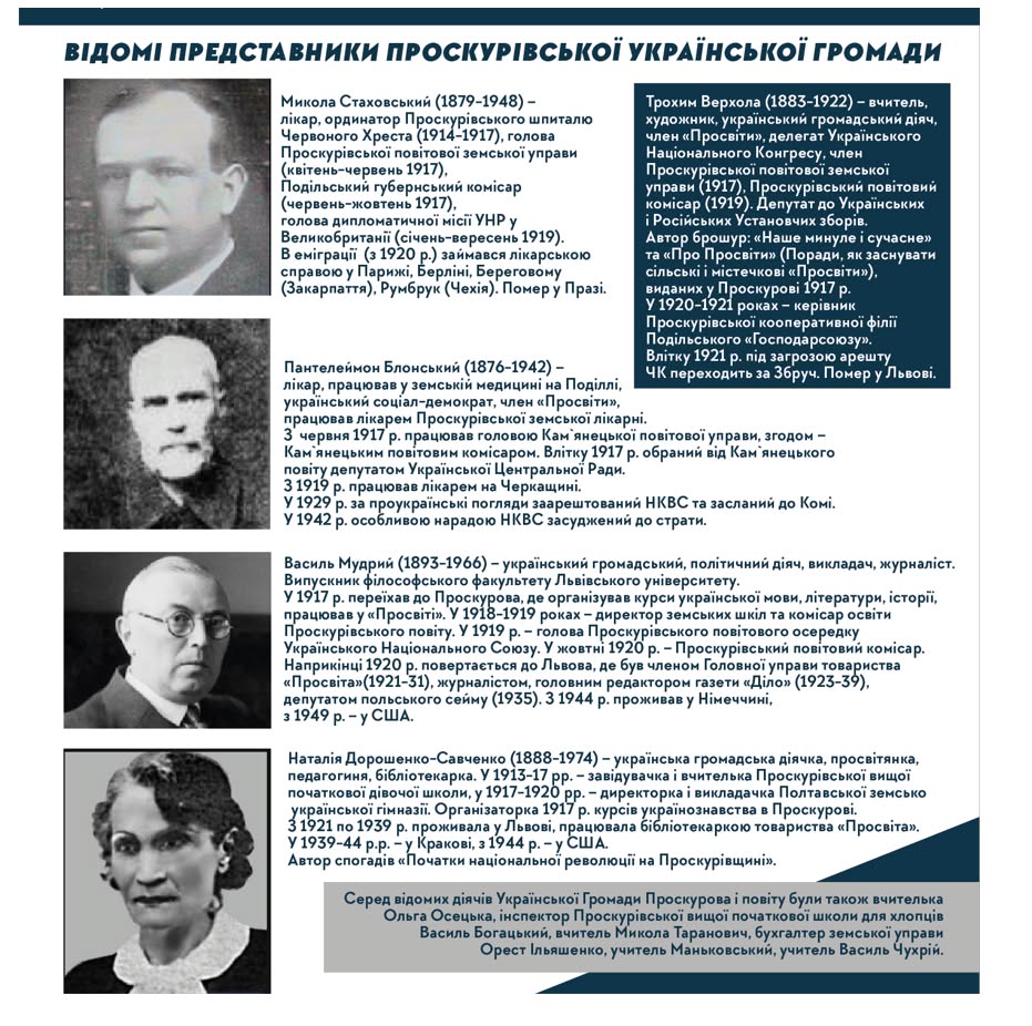 Навесні 1917 року в Проскурові українці міста та повіту об`єдналися для активної участі в громадсько-політичному житті краю. 10 березня 1917 року організувалася Проскурівська Українська громада. Головою обрали лікаря Миколу Стаховського, заступником – лікаря Пантелеймона Блонського, секретарем – телеграфіста залізниці Костя Місевича. Активними членами громади були демобілізований вояк, колишній політв`язень, маляр Трохим Верхола, політичний, культурний діяч, просвітянин родом з Галичини Василь Мудрий, директорка Проскурівської виділової школи для дівчат Наталя Дорошенко-Савченко, вчитель Микола Таранович, директор Проскурівської виділової школи для хлопчиків Василь Богацький.