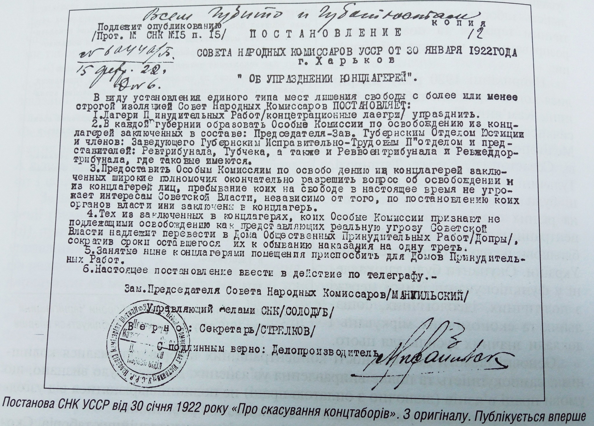 Ідея створення таборів для класових противників комуністичної диктатури належить більшовицькому вождю Владіміру Ульянову-Лєніну, який 9 серпня 1918 року в урядовій телеграмі пензенському губвиконкому доручав: «Необхідно організовувати посилену охорону з добірно надійних людей, провести нещадний масовий терор проти куркулів, попів і білогвардійців; сумнівних замкнути в концентраційний табір поза містом». У боротьбі за владу більшовицька диктатура прагнула якщо не знищити всіх своїх ворогів, то хоча б ізолювати їх, зламати морально та фізично, приневоливши під конвоєм задарма працювати і в роботі «перевиховуватися». Ідеально для цієї мети підходили табори: концентраційні, примусових робіт, особливого призначення, виправно-трудові. Великі будови, стратегічні господарські об`єкти, лісорозробки, розробки корисних копалин російської комуністичної імперії переважно й примножували такі безправні раби, в`язні концтаборів – оголошені класовими ворогами пролетаріату широкі верстви населення: інтелігенція, офіцери, духовенство, заможні селяни… Створювали і керували таборами примусових робіт губернські ЧК («чрезвичайки», надзвичайні комісії – авт.), потім, за розпорядженням із центру, їх передавали в підпорядкування губвиконкомам. Ув`язненню підлягали особи, щодо яких ухвалювалися відповідні постанови відділів управління виконкомів, надзвичайних комісій, ревтрибуналів, народних судів та інших органів, яким це право було надане декретами й розпорядженнями. Офіційно появу нових каральних установ закріпила постанова ради народних комісарів російської радянської республіки від 5 вересня 1918 року «Про червоний терор», де наголошувалося, що «необхідно убезпечити радянську республіку від класових ворогів шляхом ізолювання їх в концентраційних таборах». Наприкінці 1918 року розпочалася нова неоголошена війна кремля проти Української Народної Республіки. З росії на окуповані терени поширювалися законодавчі норми, надсилалися спеціально підготовлені кадри для здійснення репресивної політики нищення непокірних та інакомислячих. Окупантів перш за все цікавило вивезення з України награбованого та закріплення своєї влади: зброєю, терором, залякуванням, введенням системи заручників, масовим вербуванням сексотів-донощиків. У 1918-1919 роках більшовицькі лідери розробили докладно обґрунтовану модель превентивного терору, що ліквідував одну частину населення й паралізував силою страху, знущання й покори іншу. Початок правовому регулюванню діяльності концентраційних таборів поклала урядова постанова рнк «Про табори примусових робіт», опублікована в часописі «Власть советов» у травні 1919 року. Створювали й керували таборами примусових робіт губернські ЧК, потім їх передали в розпорядження губвиконкомів. Декрет ВЦВК «Про табори примусових робіт» за підписом М. І. Калініна від 15 квітня 1919 року узаконив впровадження табірної системи й примусової праці, регламентував порядок та умови організації таборів. Рекомендувалося облаштовувати ці виправні заклади з урахуванням місцевих умов, «як у межах міста, так і в маєтках, монастирях, садибах і т. д, що розташовані поблизу». У російській федерації також використовували площі широкої мережі концтаборів, де утримувалися військовополонені Першої світової війни. До літа 1918 року деякі 