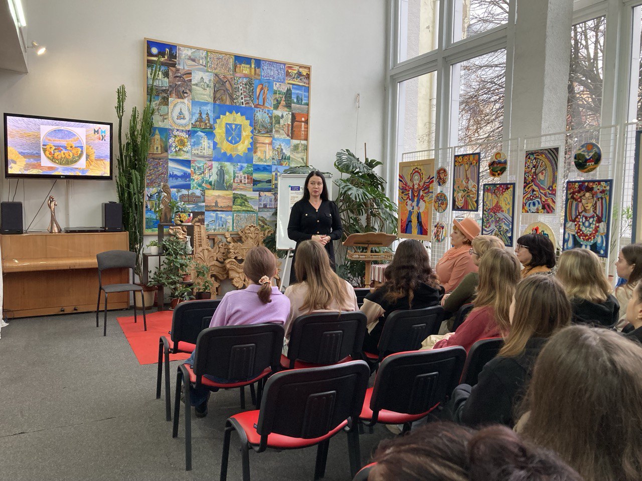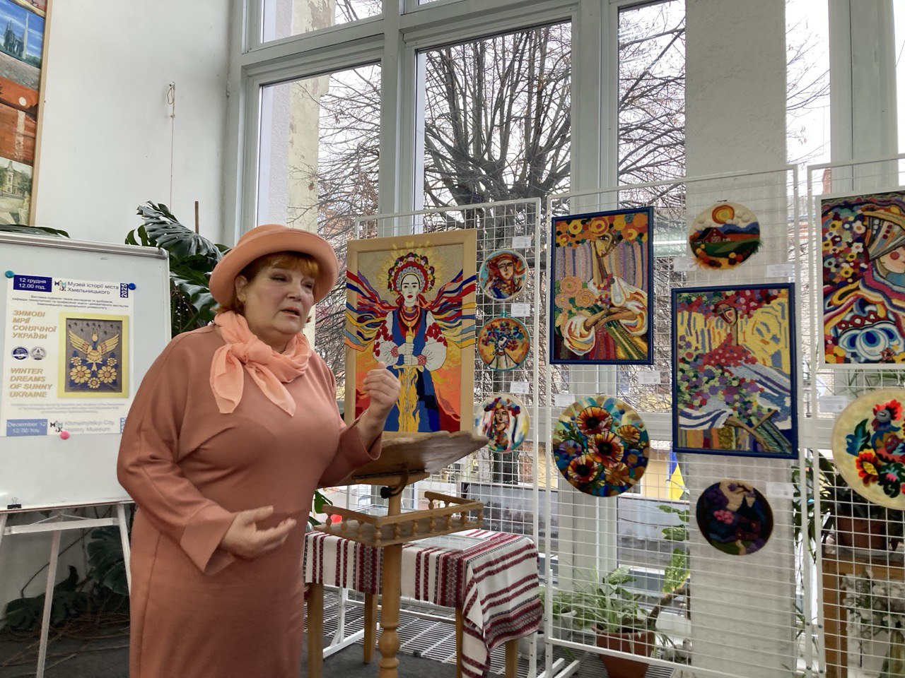 У синергії натхненного викладання творчих дисциплін з плідним опануванням студентами найрізноманітніших декоративних технік виконання, де навчання базується на оволодінні традиційними і новітніми техніками та технологіями декоративного мистецтва, народжуються амбітні шедеври, що підкорюють фахове журі на мистецьких конкурсах не лише в Україні, а й далеко за її межами, ділиться з присутніми неабиякою результативністю освітнього процесу на факультеті пані Неля. І не дарма рівень майстерності педагога з образотворчого та декоративного мистецтва справедливо оцінюється насамперед рівнем майстерності його учнів. А про завзяту плідність викладачів і студентів сам за себе каже вагомий звітний інформаційний рядок про безліч проведених ними виставок: лише тільки за воєнні роки з 2022 по 2025 кафедра взяла участь у понад 60 виставках. Традиції розвиваються разом із суспільством, його технологічним поступом, набуваючи нових форм та не втрачаючи при цьому національної суті, зберігаючи етномистецьку ідентичність, що вирізняє Україну з-поміж інших країн світу як країну, що має глибоке прадавнє коріння, свою непересічну, багату і розмаїту культуру у цьому глобалізованому, однаковому для всіх світі, зазначила директор музею. Пані Галина Барабаш зауважила: «Німецький філософ ХХ століття Карл Ясперс розрізняв людину народу, зв'язану з традиціями, та людину маси – безлику в глобалізації, людину, яка втрачає зв'язок з народом і свободою. Людина народу має сама себе творити, не розчиняючись у безликій масі, а залишаючись частиною справжнього народу, що зберігає національну ідентичність. Важливо мати зв’язок з джерелом, і, не втрачаючи його, ми маємо пам’ятати, якого ми народу люди. Важливо вберегти цей спадок, а успадковане - відшліфувати, зберегти і передати наступним поколінням». Пані Лариса Корницька, доцент кафедри, кандидат педагогічних наук, розповіла про те, що на виставці представлено 12 текстильних декоративних технік, об’єднаних під однією назвою: «Зимові мрії сонячної України». На її думку, це своєрідне уособлення мрій усіх нас, українців, про найочікуванішу та найжаданішу подію для України – про Перемогу.