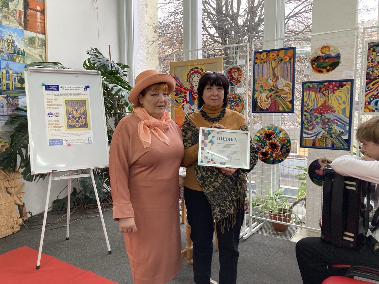 Невипадково відкриття виставки «Зимові мрії сонячної України» зібрало чимало шанувальників декоративного мистецтва в музеї історії міста Хмельницького саме в особливо енергетичну грудневу дату: дванадцятого дванадцятого о дванадцятій. Такі дзеркальні дати завжди привертають увагу, створюючи відчуття символічного вікна долі, коли енергія дня, місяця, року сходиться в одну точку. І 12 грудня – одна з таких дат: це день, коли бажання звучать голосніше, а думки матеріалізуються швидше. І цього дня всі присутні, надихаючись сонячною палітрою сучасної української текстильної етніки, бажали одне одному перемоги України та вголос висловлювали думки про збереження національного мистецького спадку та його інтегрованість у сучасність. На відкриття колективного вернісажу художніх творів викладачів і здобувачів кафедри технологічної та професійної освіти і декоративного мистецтва гуманітарно-педагогічного факультету ХНУ завітали студенти та їх наставники, шанувальники етніки та декоративного мистецтва, музейники, працівники міської галузі культури, освітяни, хмельничани, котрі цікавляться народним мистецтвом, в якому живе дух нації, що з діда-прадіда передається з покоління в покоління в багатьох українських родинах, який надихає нині молодь на осучаснення народних промислів і ремесел, виводить їх на трендовий рівень у сучасному світі цифрових технологій та масової глобалізації. За вікном похмура непривітна календарна зима, а в мистецькій експозиції музею затишно розквітло справжнє українське літо – в буянні фарб численних декоративних текстильних технік, тонкощам яких навчає талановитих хлопців і дівчат група викладачів Хмельницького національного університету на кафедрі технологічної та професійної освіти і декоративного мистецтва гуманітарно-педагогічного факультету. Розмаїття дванадцяти текстильних технік, представлених вісьмома десятками життєрадісних робіт авторства студентів кафедри 2023-2025 років навчання, занурило присутніх у неймовірний світ тканих і нетканих гобеленів, джгутової філіграні, ворсового килимарства, фелтингу, що зветься також і живописом вовною, макраме, батику, текстильної аплікації, об’ємної вишивки, які майстерно і з любов’ю викладаються у ХНУ групою викладачів – Ларисою Корницькою, Вікторією Хреновою, Оксаною Пястук, Богданом Круликом під очільництвом Олени Самборської – завідуючої кафедри технологічної та професійної освіти і декоративного мистецтва Хмельницького національного університету. Тож на презентації вернісажу подяками управління культури і туризму Хмельницької міської ради було відзначено кафедру ТПОіДМ ХНУ та її викладацький склад, під наставництвом якого й створено цей найяскравіший етновернісаж року у Хмельницькому. Директор музею пані Галина Барабаш у вітальному слові до гостей і творців вернісажу, попередньо вшанувавши символічною хвилиною мовчання полеглих Героїв, завдячуючи яким нині можливі такі мистецькі зібрання, представила кафедру технологічної та професійної освіти і декоративного мистецтва ХНУ, що гуртує навколо себе творчих неординарних особистостей - як викладачів, так і студентів - уже понад чверть століття задля збереження національної спадщини та адаптування її до сучасних мистецьких світових тенденцій.