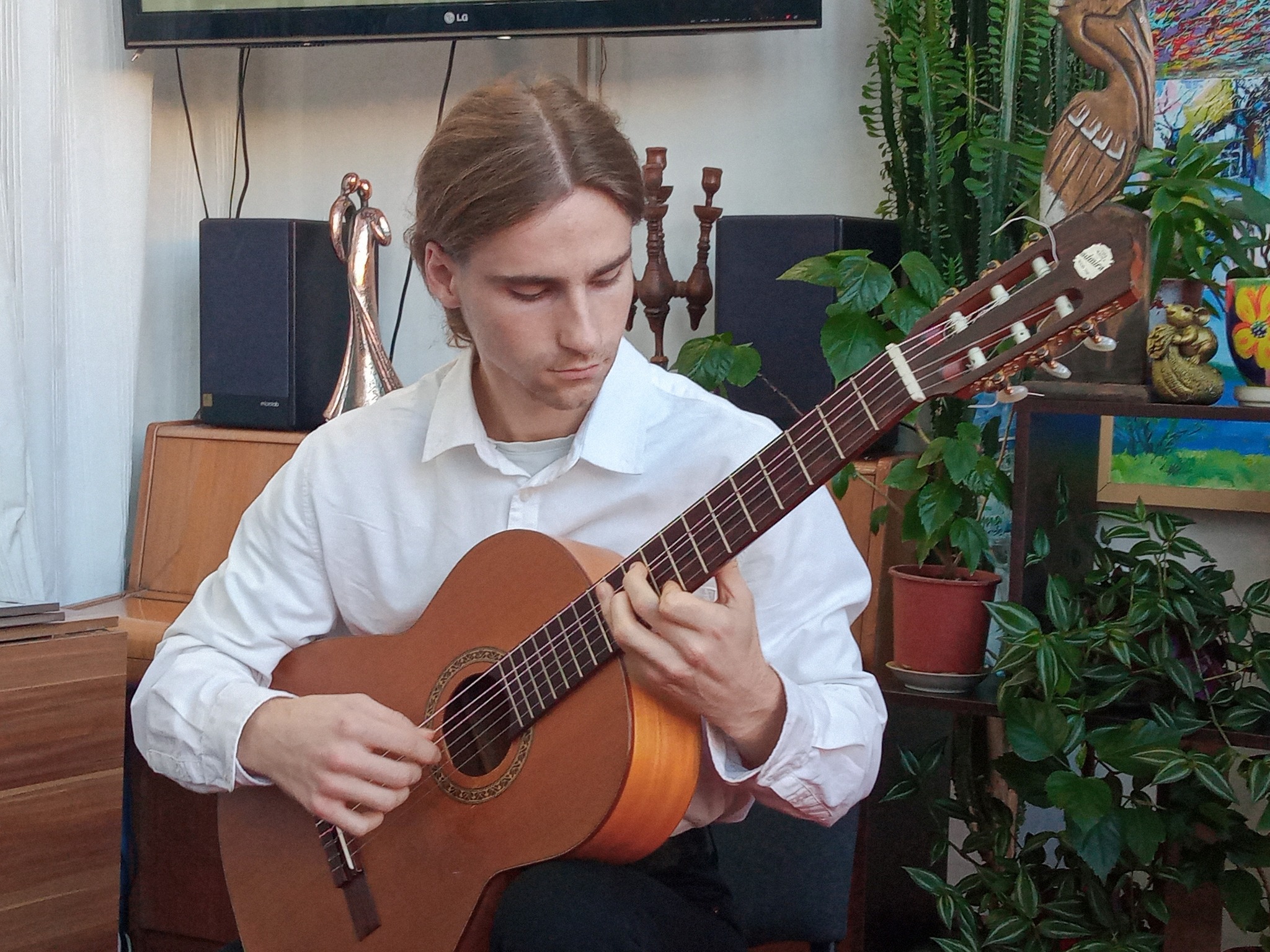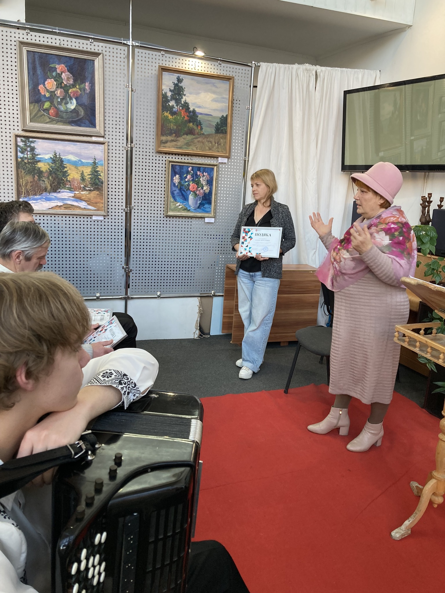 Студент ІІ курсу Євгеній Лищук виконав на баяні джазову композицію Віктора Власова «Босса Нова», студентка ІІІ курсу Ксенія Сіра зіграла «Румбу» Степана Рака на гітарі. Третьокурсник Олексій Вельський подарував слухачам композиції «Етюд» Буркхарда Вольтерса та «Фуоко» Роланда Дієнса. Гості продовжили зацікавленне спілкування та обмін враженнями за переглядом експозиції. І, звісно, традиційно зробили спільне фото на добру згадку.