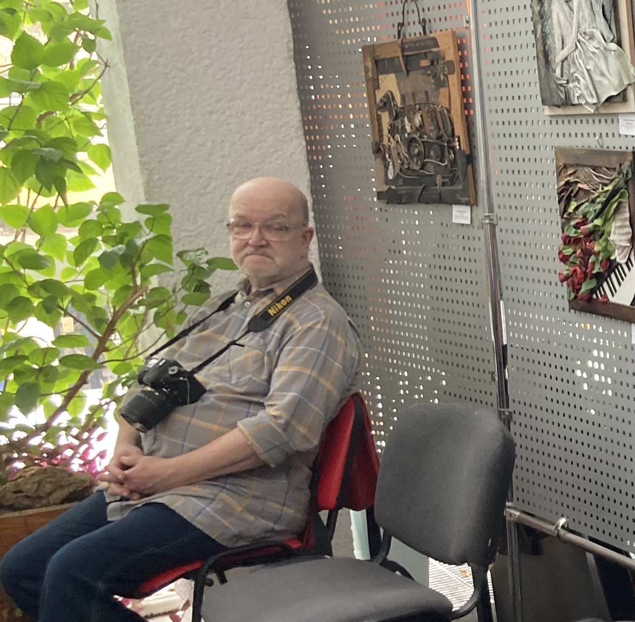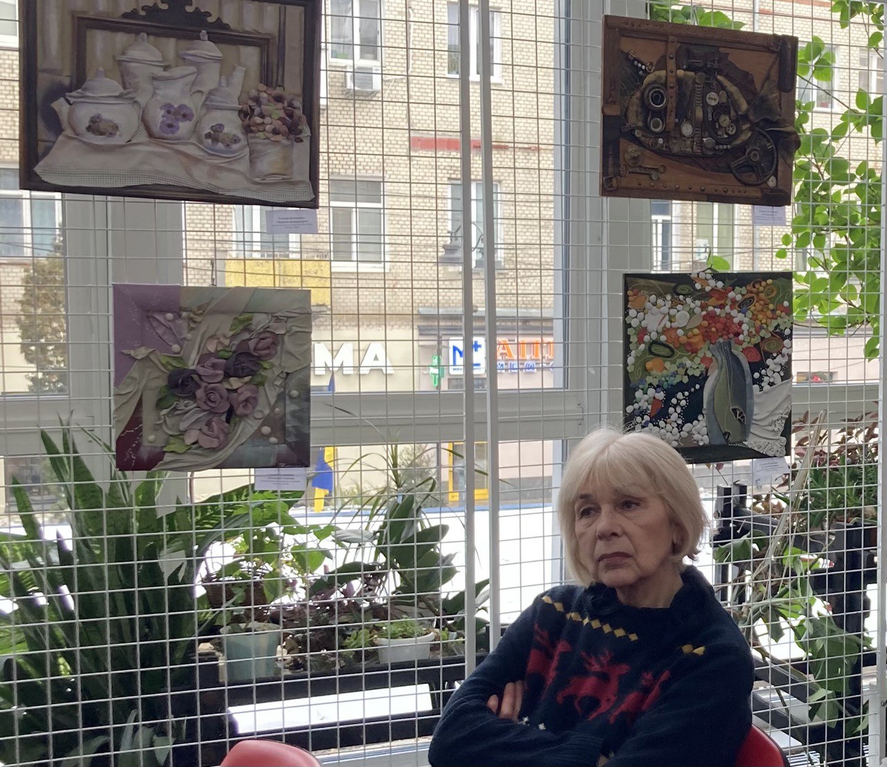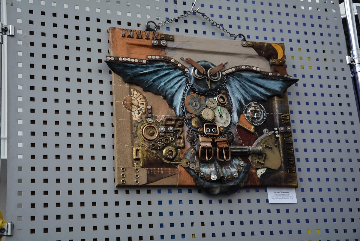 І, коли в периметрі цього мистецького хіт-параду творчих образів та ідей, органічно поєднаних фарб і кольорів ти занурюєшся в розмаїтий авторський дивосвіт, то, здається, чуєш наяву чарівну музику цих механізмів, паровозів, старих годинників, ключів, шестеренок, телефонів, клаксонів, заклепок, гайок, швейних машинок, втулок, пряжок і замків… Тебе пронизує до денця серця щемна мелодія одинокого скрипаля – «Янгола над містом»… Ти вчуваєшся, як цокотить по асфальту коротенькими лапками-коліщатками ота мила механічна такса з несподіваних залізок, як булькають, дрейфуючи дном океану лупаті самозакохані «Технориби», як шелестять на вітрах ці пелюстки квітів, листочки дерев, лопотять, вилискуючи золотими сонцепромінчиками, «Вітрила»… Душевний комфорт по-домашньому створюють лагідні лілові троянди з «Бузкового сюжету» та квітуючі фіалочки у вазонку на серветочці з «Весняного настрою»… Ти вже подумки мандруєш покрученими вуличками поміж мурами «Старого містечка» над морем, боязко переходиш темний ковзкий міст над закутою в льоди рікою «Вечірнього міста», чимдуж добираєшся до теплої хижки під лісом у «Зимових Карпатах»… А як самозабутньо віддається музичній стихії віртуозна «Скрипалька» на концертній сцені! Як потужно, розкрилено огортає всю цю красу земну небесний мудрий воїн «Нічний вартовий» сова-мілітарі, котра й стала знаковим символом на афіші нинішньої виставки… Скільки історій здатна навіяти кожна композиція, яку фантазію пробудити…