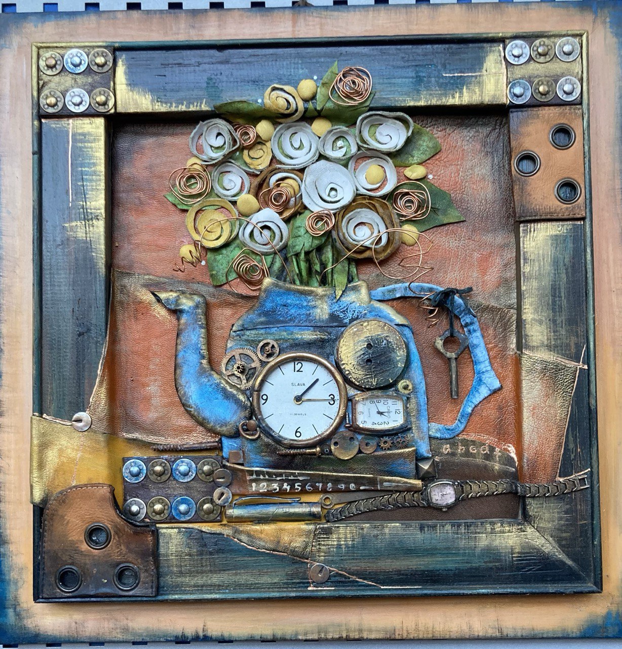Сміливий творчий експеримент хмельничанки Галини Клименко, який триває уже кілька десятиліть, викликає незмінний жвавий інтерес, непідробне захоплення та вдячні відгуки у кожного, в чиє поле зору потрапляють ці, без перебільшення, висококласні й гармонійно виплекані художні роботи. Саме - «виплекані», адже створені з великої кількості деталей, фрагментів, котрі завдяки зіркому оку, оригінальному фантазійному баченню, дивовижно точній, справді інженерній думці, що конструює чітко, функціонально, без зайвого перевантаження, але з глибинним символічним підтекстом, абсолютно доладно лягають на простір кожної картини, вивершуючи органічний симбіоз фактур: шкіри та металевих частин механізмів. Ось де – безмежна царина для роздумів, мрій, спогадів, мистецьких запозичень, філософських екзерсисів та інтерпретацій! Але набагато цікавіше, ніж послухати про цю чудову виставку, самим завітати до нашого музею, насолодитися красою й збагатити свій душевний досвід незабутньою естетичною насолодою. Тож ласкаво запрошуємо шанувальників краси до нашої мистецької зали, на Проскурівську, 30! До речі, пані Галина Клименко наголосила, що вона – відкрита для спілкування, завше готова проводити майстер-класи для студентів та всіх, охочих до творчого самовдосконалення. Не проґавте унікальний шанс! Оксана СОБКО, провідний науковий співробітник музею історії міста Хмельницького. Світлини Вікторії ПАПОНОВОЇ та Леоніда ЗАПАДЕНКА |