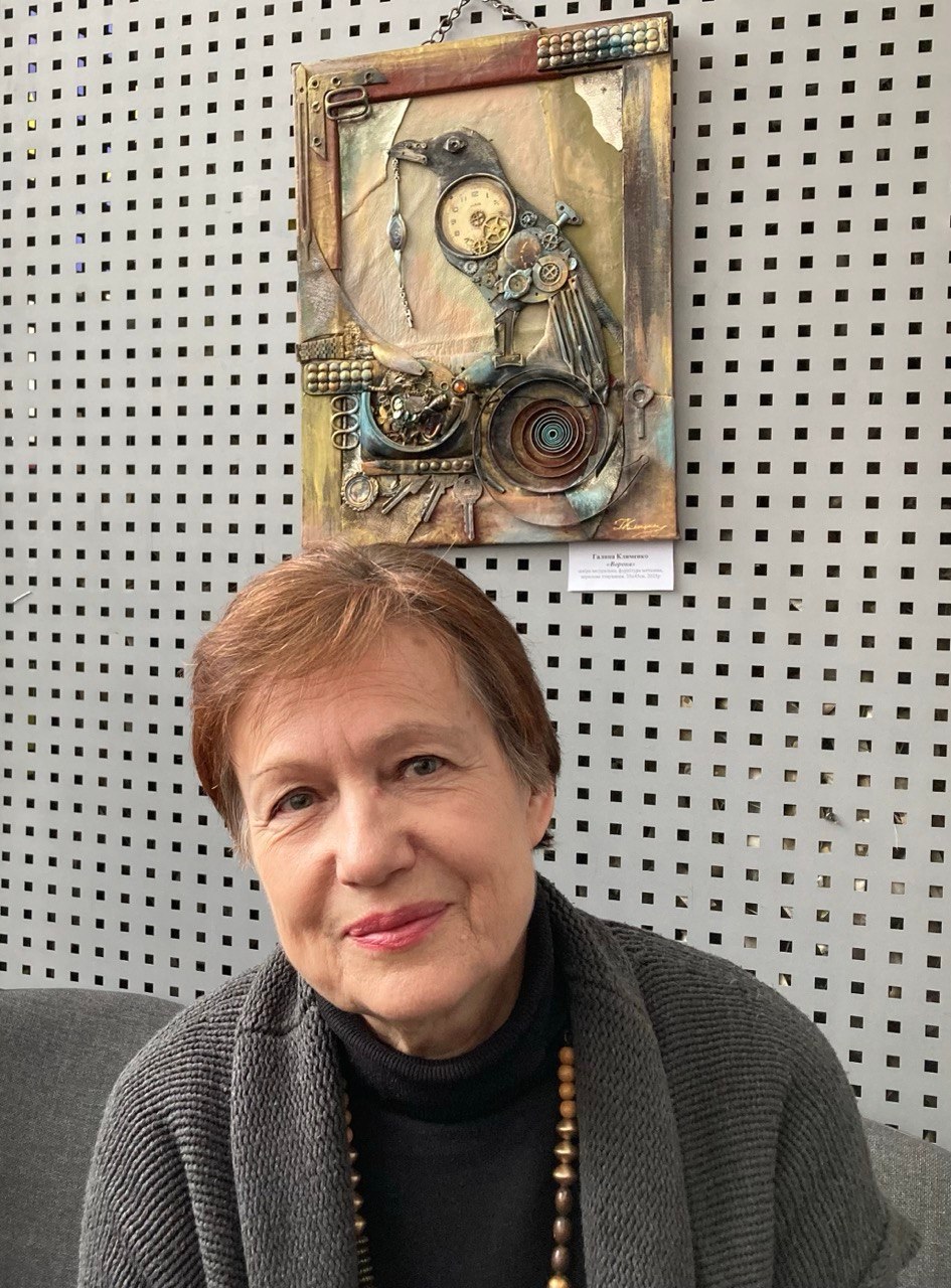 Галина Клименко розповіла про свій творчий шлях, поділилася секретами мистецької лабораторії. Народилася майстриня в м. Шепетівка на Хмельниччині. Закінчила Український інститут інженерів водного господарства за спеціальністю «інженер-гідротехнік». Працювала у Хмельницькому облвиконкомі, міському пенсійному фонді, майже два десятки років – директором виробничо-комерційної фірми «Аланс». Не навчалася у мистецьких закладах, але з дитинства любила малювати, «все своє життя малювала зарисовки, ескізи». Лише після виходу на пенсію, з 2010 року, Галина Григорівна змогла присвятити час улюбленому заняттю. Вона повсякчас – у творчих пошуках. Самостійно опанувала і працює у різних техніках: пресована флористика (виготовлення панно, картин з сухих пресованих квітів), колажі «терра» (композиції з різноманітних природних матеріалів: гальки, мушлів, коріння, насіння рослин), декупаж (декорування різних предметів, поверхонь художніми мотивами), художня обробка шкіри (створення художніх панно, картин з натуральної шкіри), стимпанк (фантазійне поєднання образів тварин, риб, птахів, предметів з механічними деталями) в картинах і панно…