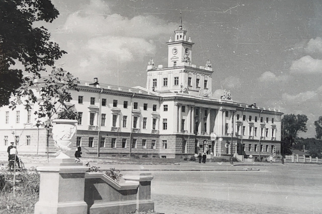 низки перших 3-4 поверхових житлових будинків у центральній частині міста, центрального парку («Парк культури і відпочинку імені Михайла Чекмана»), готель «Жовтневий».